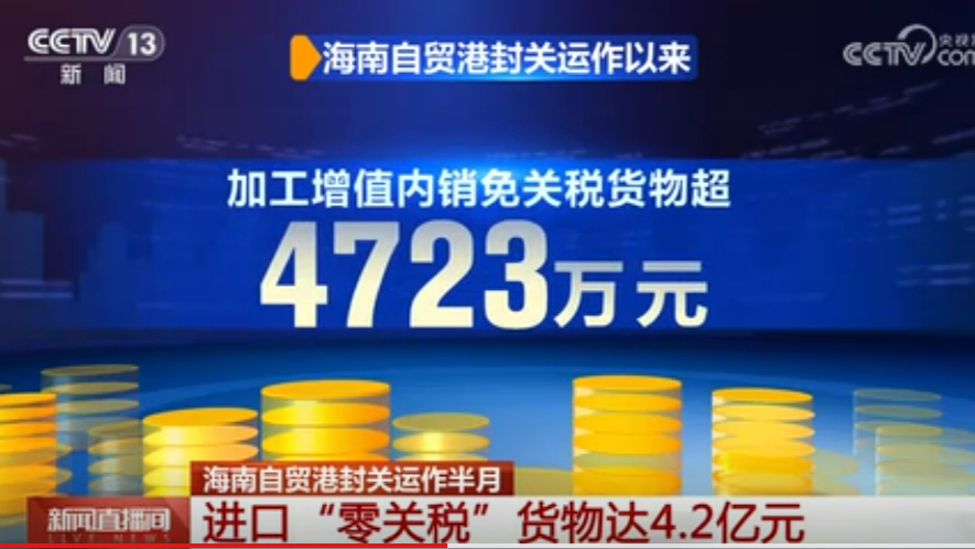 ဟိုင်နန် လွတ်လပ်စွာ ကုန်သွယ်ရေး ဆိပ်ကမ်း၏ အထူး အကောက်ခွန် လုပ်ငန်း စတင်ခဲ့ သည့် လဝက်အတွင်း အခွန်ကင်းလွတ်ခွင့်ရ သွင်းကုန်များ စုစုပေါင်းတန်ဖိုးသည် ယွမ် သန်း ၄၂၀ ရှိ